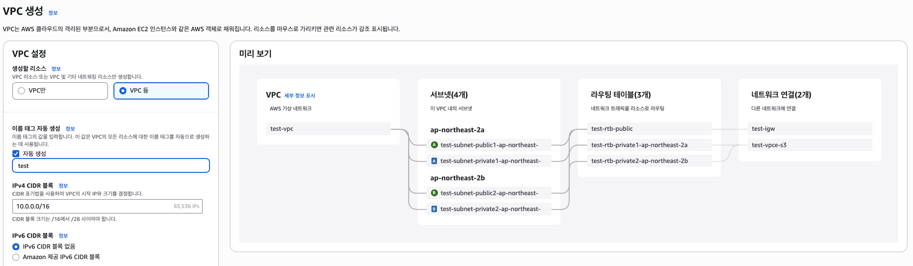이렇게 생성하면 VPC, 서브넷, 라우팅 테이블, IGW까지 연결된 상태로 생성되게 됩니다.