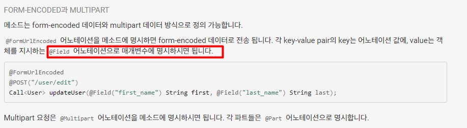@Field = @FormUrlEncoded(=key-Value, ) @POST,에서 사용하며 매개 변수를 숨기고 URL을 추가하지 않는다.