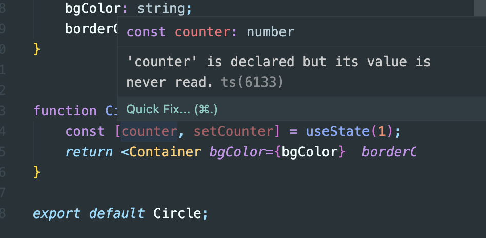 근데 여기서 state의 defalut 값을 '숫자 1' 로 주면 아래 사진과 같이 typeScript는 앞으로 counter이라는 state는 int로만 접근을 해야한다 라고 인식을 한다.